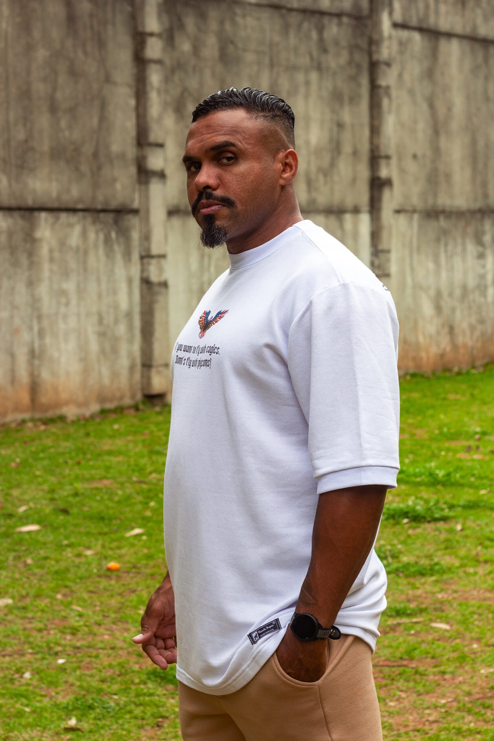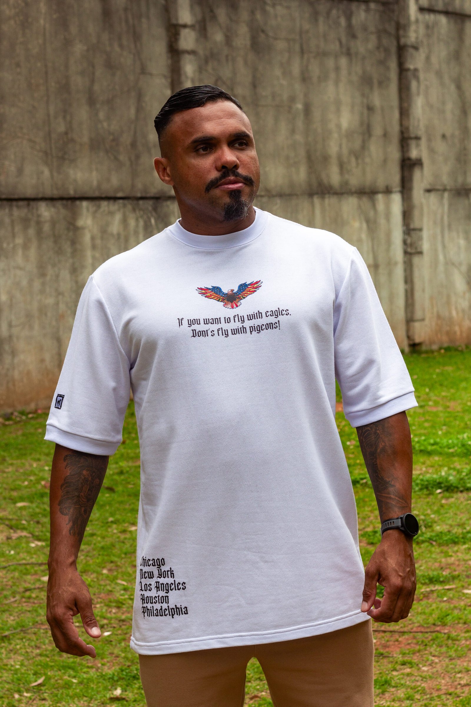 Estilo e atitude se unem nesta camiseta oversized em moletinho premium, que entrega conforto e presença em cada detalhe. A gola e os punhos canelados reforçam o caimento moderno da peça. Nas costas, a estampa poderosa de uma águia preenchida com a bandeira dos EUA transmite força, liberdade e superação — valores reafirmados na parte frontal com a mesma arte em versão reduzida e uma frase motivacional de autoafirmação. Uma peça feita para quem carrega, propósito ,visão e determinação.